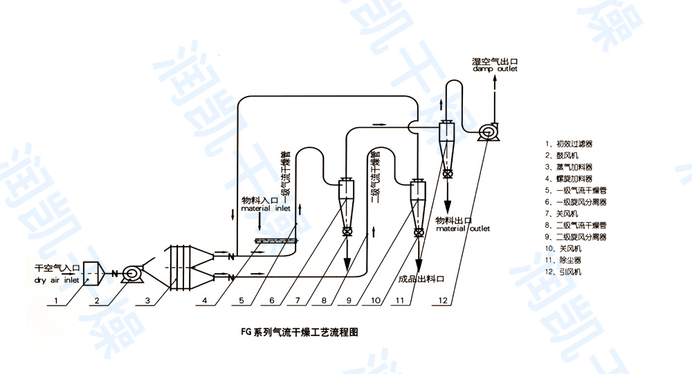 FG系列干燥机的工作原理是将湿物料的干燥分为两步完成。原料先由二级干燥之尾和补充热气的混合体进行一级正压干燥,使用后的高温低温尾气排出机外,干燥后的半成品由新鲜的热空气进行二级负压干燥。干燥后的成品计量包装。使用过的高温低温尾气用作一级干燥,从而完成良好的循环干燥过程,补充的热风量可根据需要随意调节,因而机器翻译适用性广。