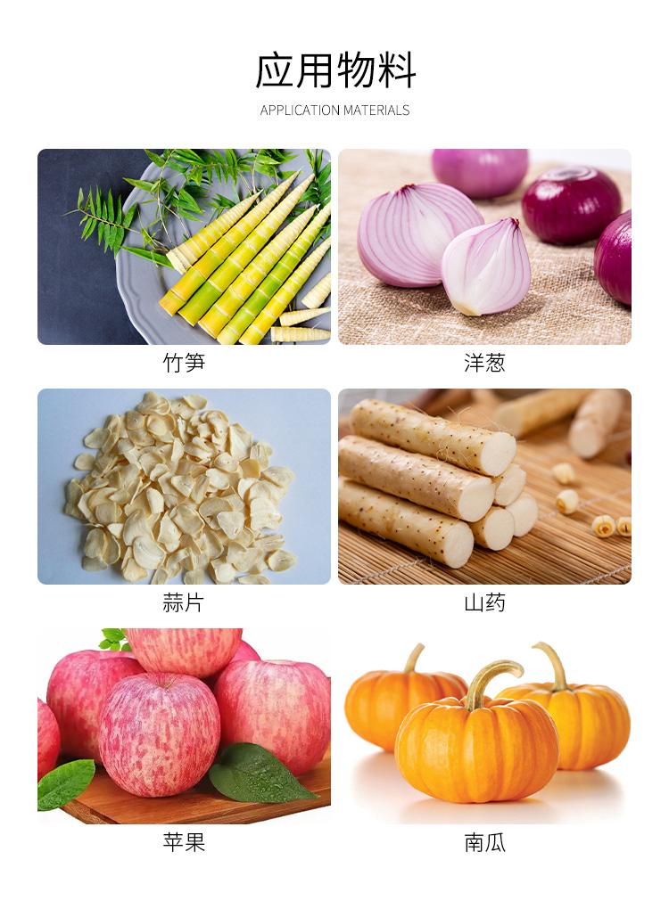 干燥的典型物料有:蒜片、南瓜、胡萝卜、魔芋、山药、竹笋、辣根、洋葱、苹果等。