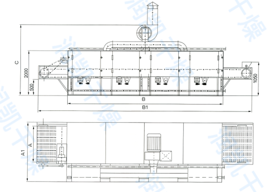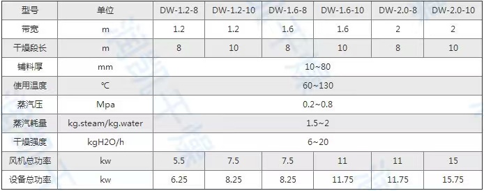 DWP型喷射气流带式干燥机,热风从狭缝或孔束流向下或向上同时喷向输送带上的物料,由于喷射气速高达15m/s以上,故对流传热的膜极薄,传热系数大,干燥速度快。该设备用于不透气类物料时,上面喷射气流仍返回上面,下面喷出的气流仍返回下面,再参与循环。对透气性物料气流束具有强穿透性及物料内部的扩散性。使用热源可以是蒸汽、电、热风炉及燃油烟通气等。