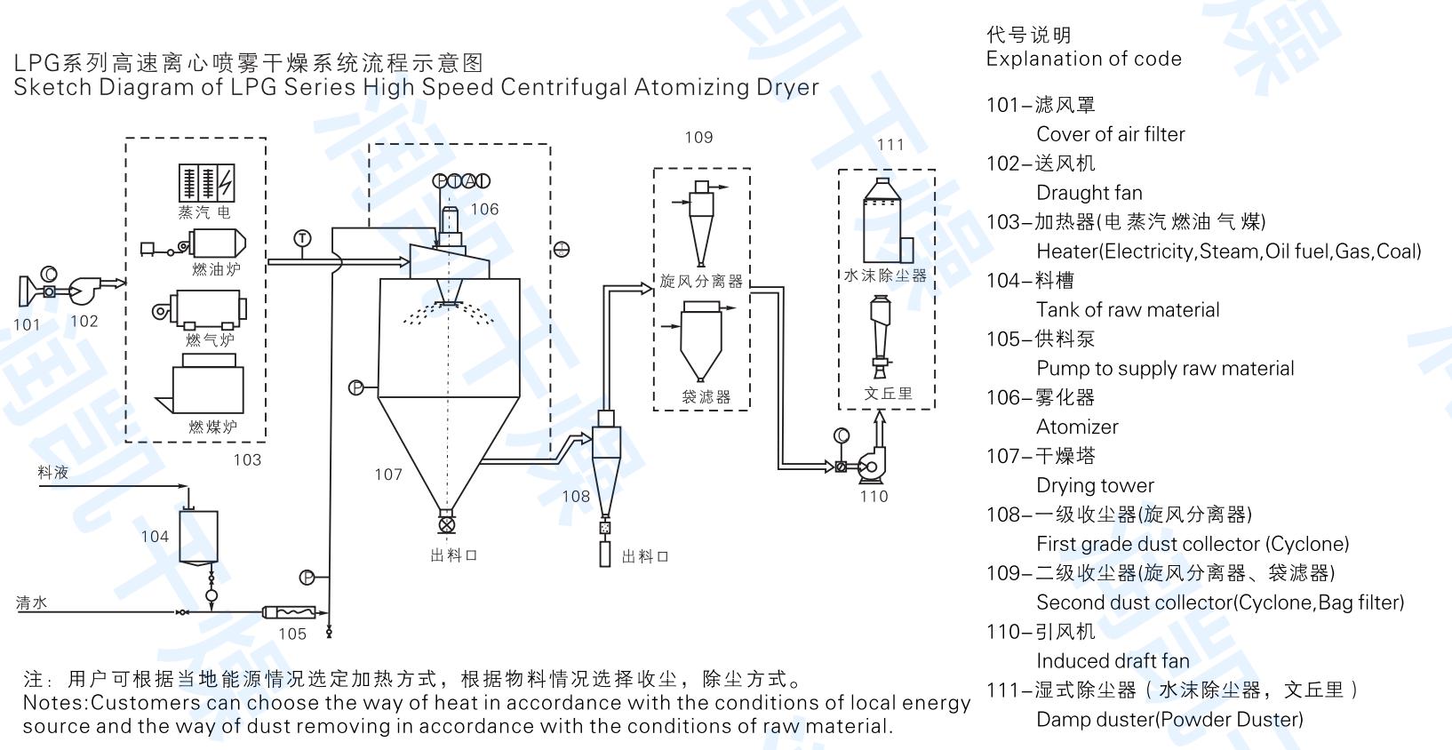 喷雾干燥机是将原料用雾化器分散成雾滴,并用热空气(或其他气体)与雾滴直接接触的方式而获得粉粒状产品的一种干燥过程。空气经过滤和加热,进入干燥器顶部热风分配器,热空气呈螺旋状均匀地进入干燥室,料液经塔体顶部的高速离心雾化器,旋转喷雾成极细微的雾状液珠,雾滴和热空气接触,混合及流动同时进行传热传质,在极短的时间内可干燥为成品,雾滴及热空气的流向有并流,逆流及混合流,接触方式不同,对干燥塔内的温度分布,雾点(或颗粒)的运动轨迹,颗粒在干燥塔中的停留时间及产品性质等均有很大影响。