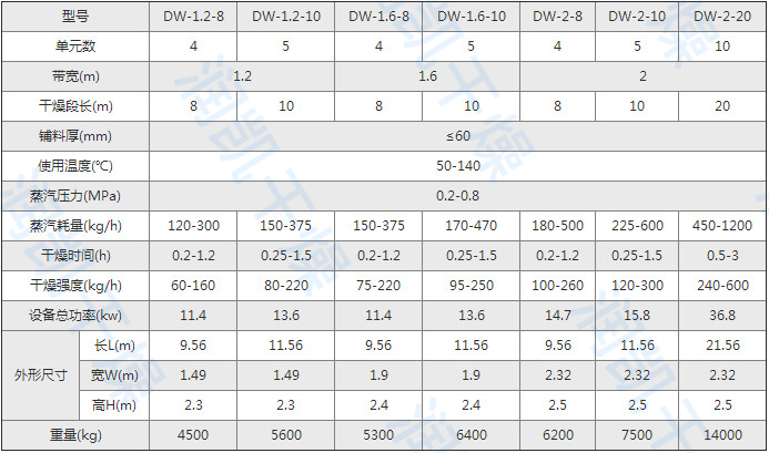 注:用户在选型时,应根据产量、物料含水量等参数选择2台或多台串联方式进行增加干燥面积,以满足使用要求,提高产品的产量。