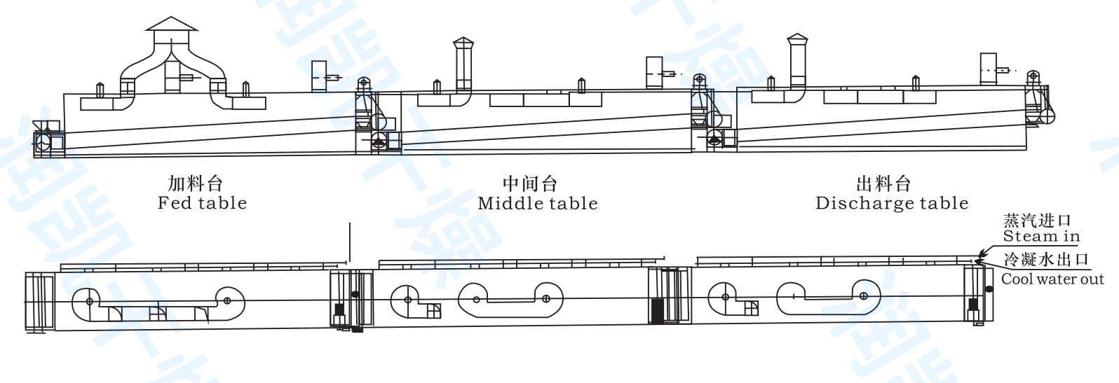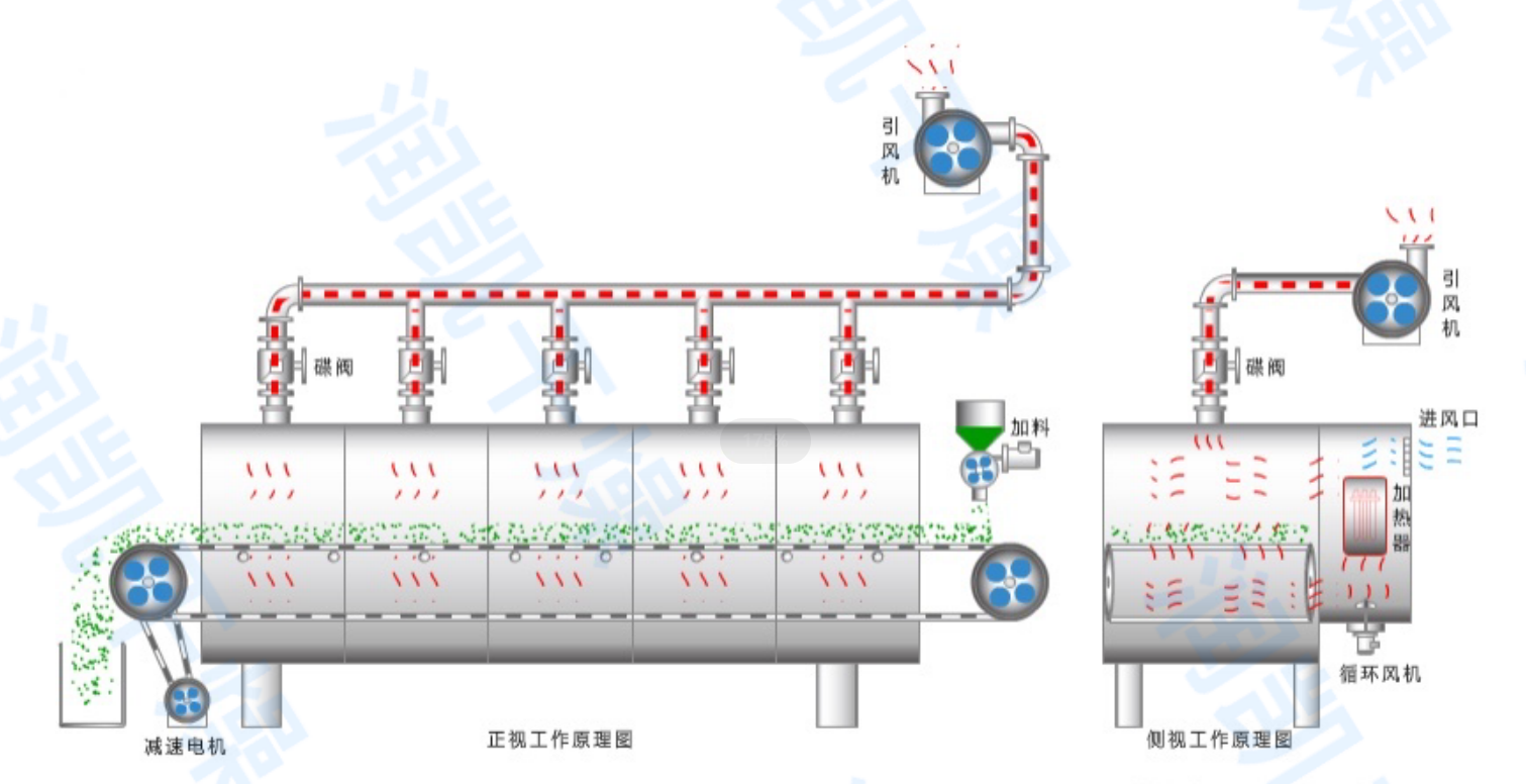 DWP型喷射气流带式干燥机,热风从狭缝或孔束流向下或向上同时喷向输送带上的物料,由于喷射气速高达15m/s以上,故对流传热的膜极薄,传热系数大,干燥速度快。该设备用于不透气类物料时,上面喷射气流仍返回上面,下面喷出的气流仍返回下面,再参与循环。对透气性物料气流束具有强穿透性及物料内部的扩散性。使用热源可以是蒸汽、电、热风炉及燃油烟通气等。